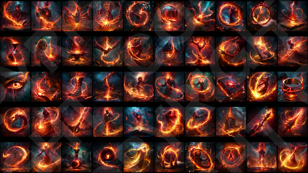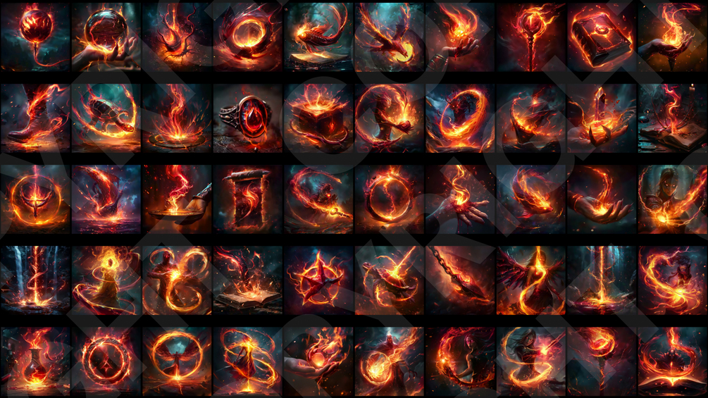 Set includes 200 unique icons of magical skills dedicated entirely to the element of Fire. Each image is meticulously crafted with attention to detail to perfectly complement fantasy and medieval-style game interfaces. This collection of fiery skills encompasses various offensive spells, defensive abilities, and unique talents capable of transforming battles into blazing spectacles. Choose from our selection of perfect weapons in the battle for mastery over Fire magic and infuse your game with magic and adrenaline.